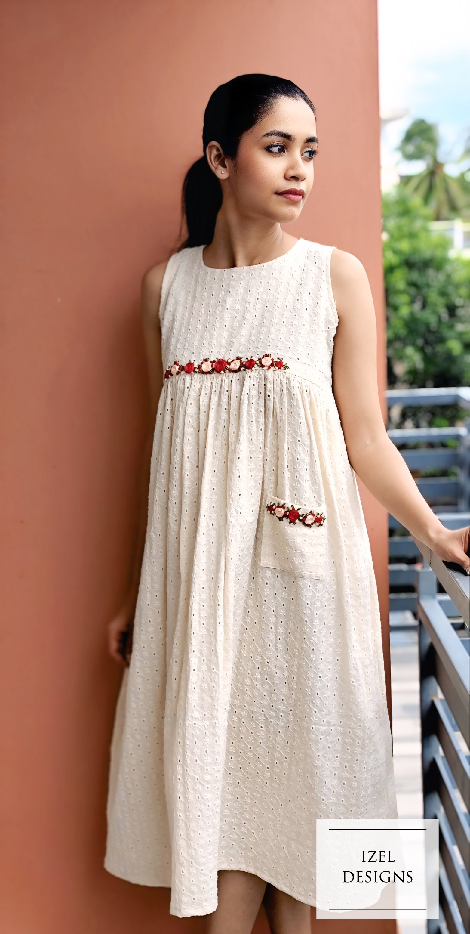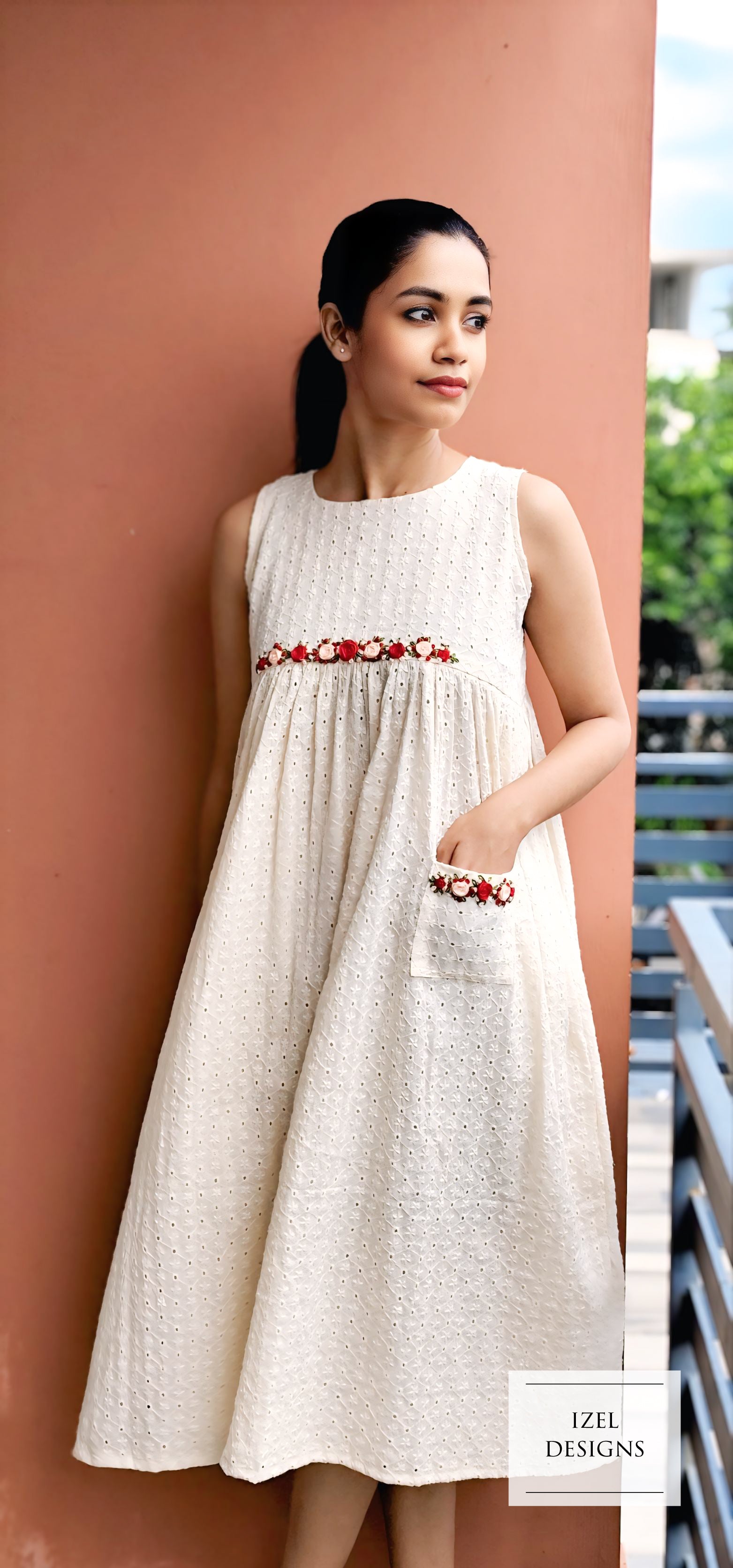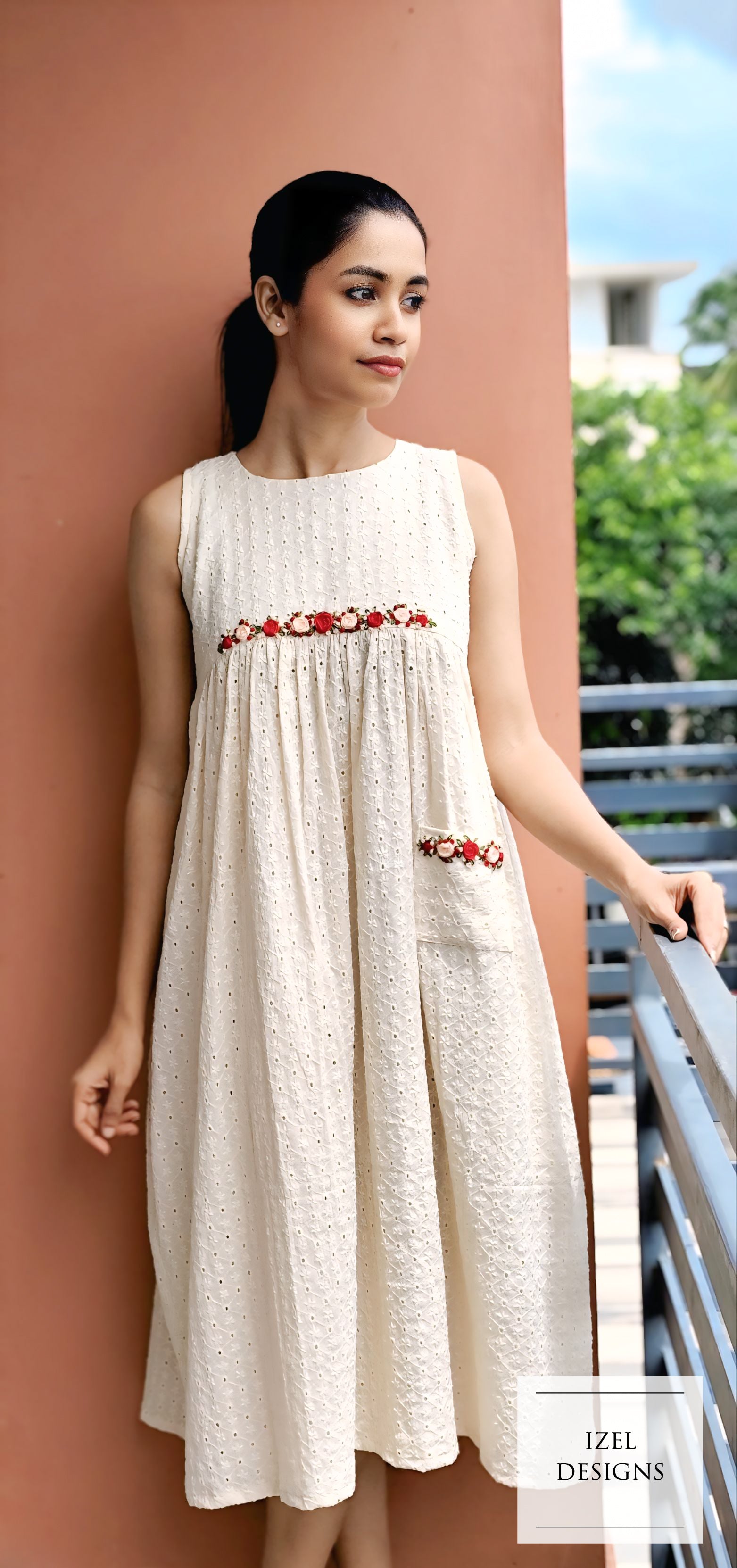 Hand embroidery gathered midi dress